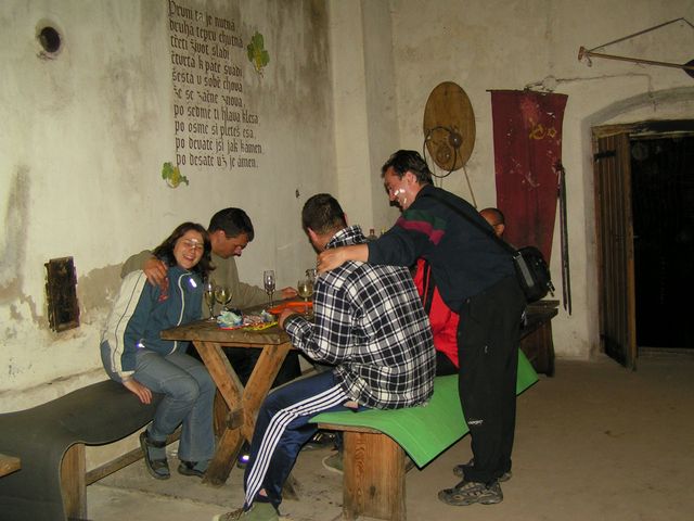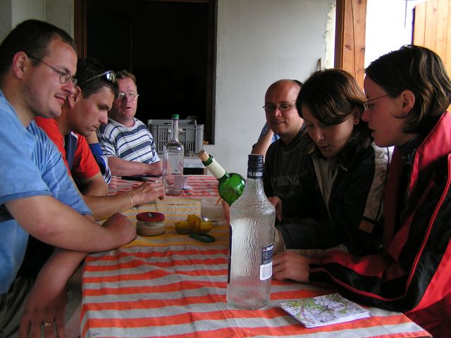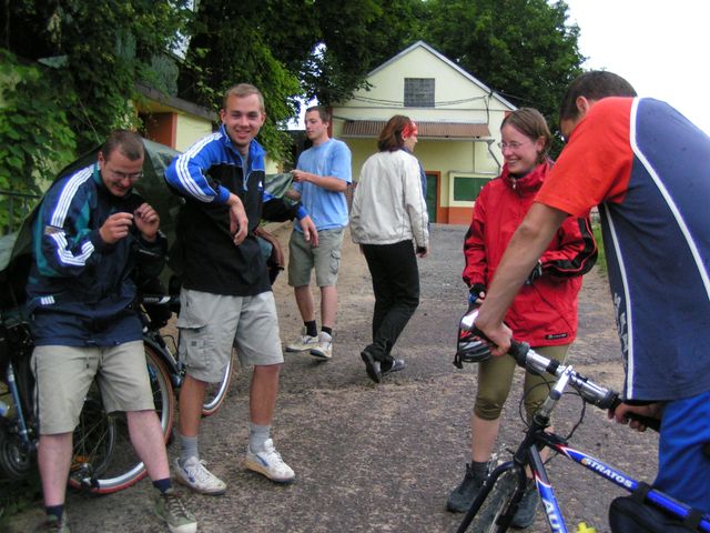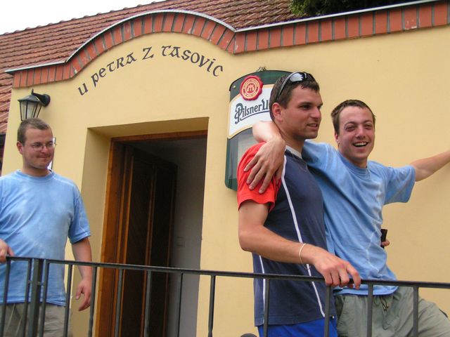 Snídaně u strýca se krapet protáhla. Úspěšně jsme mu dopili zbytky dvou slivovic a rozloučili jsme se - jak jinak - než vínem z Vrbovce. Před polednem ve velmi dobré náladě odjíždíme. Po pár kilometrech stavíme v hospodě, abychom naposledy ochutnali místní domácí slivovici. Po odchodu z hospody stěží překonáváme záchvaty smíchu a odjíždíme (přestože si Štěpán schovaný pod plachtou myslel, že ho nenajdeme). Martin nezvládá řízení a padá z kola.