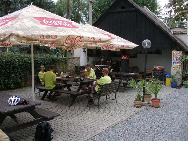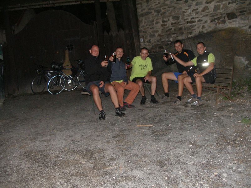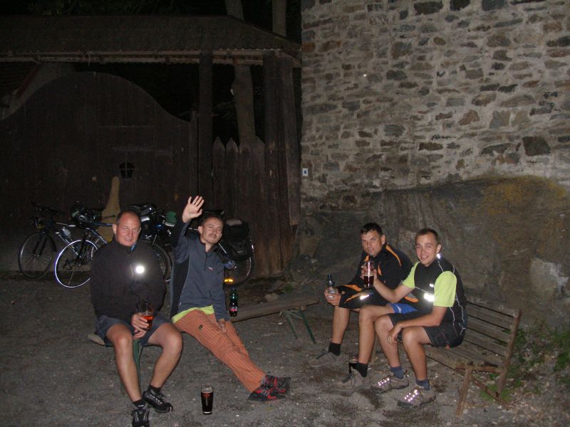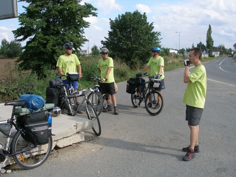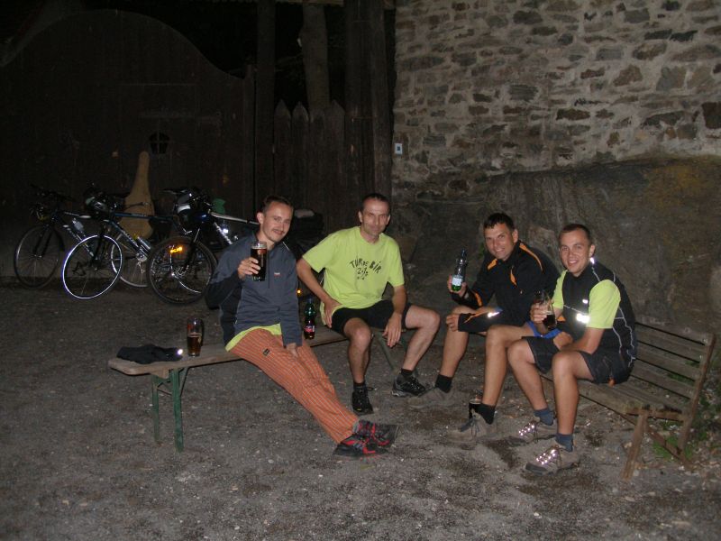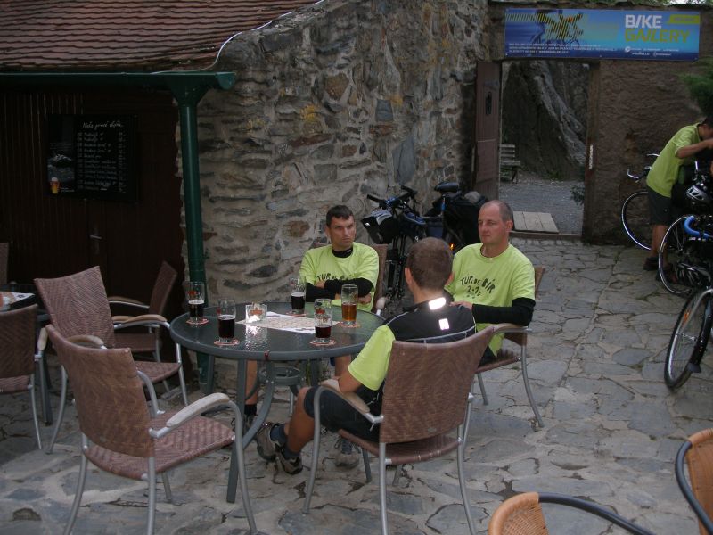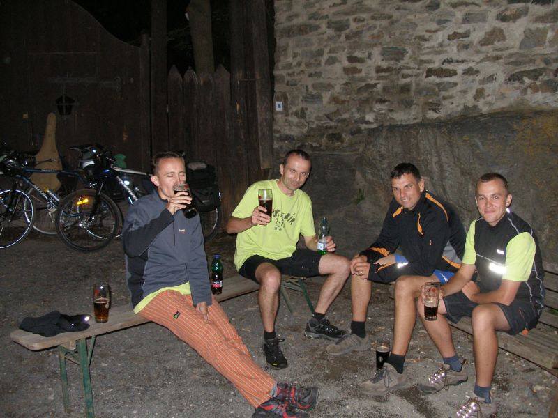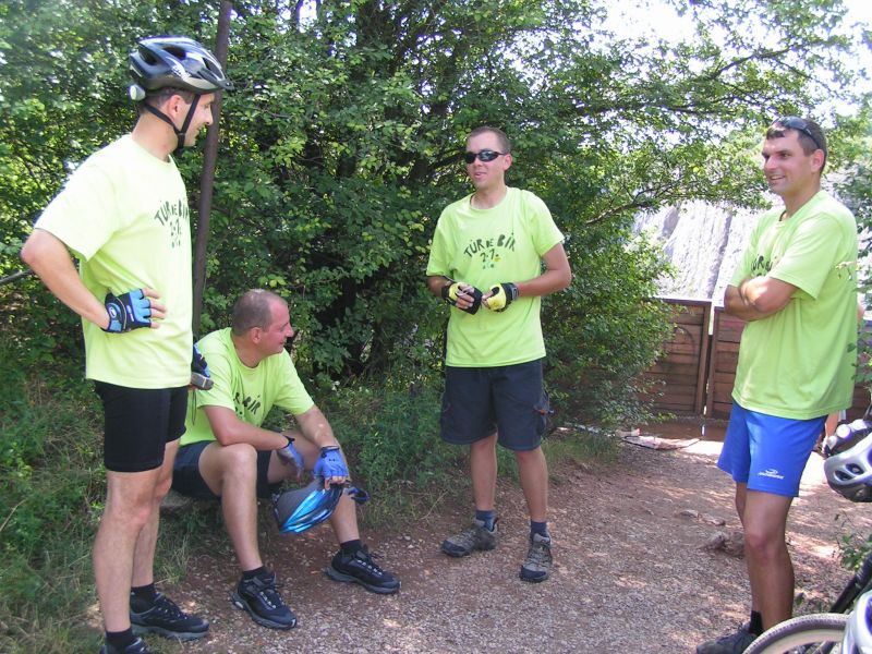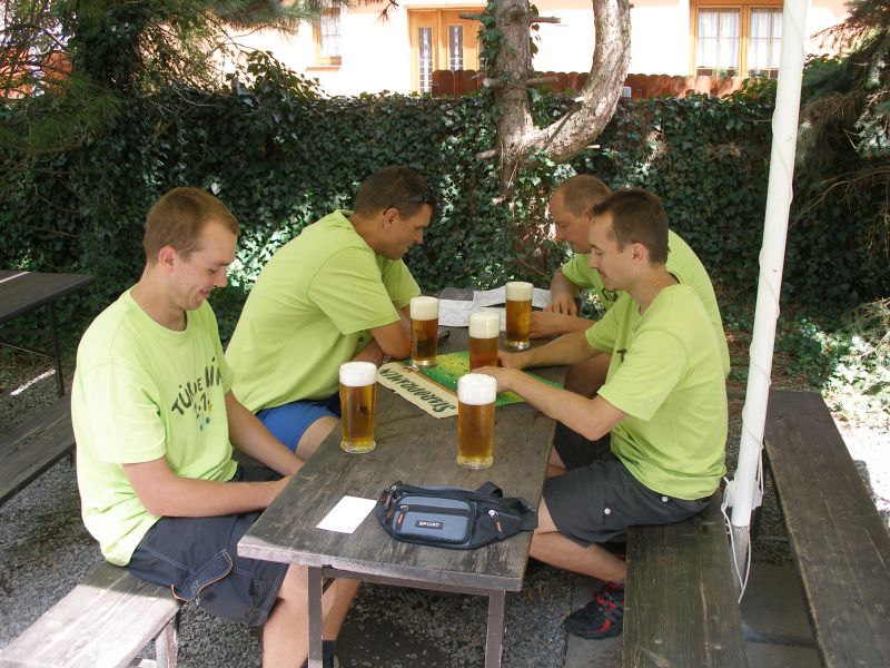 Na místo srazu u Velkého kotle dorazili všichni předem nahlášení účastníci letošního ročníku TdB – Martin, Milan, Pavča, Pepa, Petr a Tomáš. Bohužel Pavča přichází bez kola a se špatnou zprávu, že kvůli nějaké chorobě s námi nejede. Jsme z toho všichni smutní, ale když z batohu vytáhne kromě zelených trik (letošních týmových dresů), také láhev se zeleným obsahem, začnou se naše tváře rozjasňovat. Co se dá dělat, letos to bude čistě pánská jízda. Alespoň nás nic nebude rozptylovat od našeho hlavního cíle – kvalitního sportovního výkonu. Trička se Pavče skutečně povedla. Sklízí za ně ode všech zaslouženě slova chvály. Tomáš dokonce poznal na tričku i ten půllitr, ze kterého měla Pavča největší stresík ;-). Po důkladné ochutnávce přichází nezbytné focení (dokud jsme čistí a svěží). Přichází také první fanynka, vyptává se odkud a kam jedeme. To, že jí je asi 70 let, nás nerozhází. Vždyť těch mladých a krásných cestou potkáme nepočítaně … . Protože je krásné počasí, tak je zamítnut návrh některých účastníků, že před odjezdem zajdeme na jedno a pomalu se chystáme k odjezdu. Loučíme se s Pavčou (líbat se s náma nechce s výmluvou, že by nás mohla nakazit, ale Milanovi klidně bacily předává) a vyrážíme směrem Pičín a Buková. Za ní překonáváme brdský hřeben a užíváme si sjezd do Hostomic. Tam dáváme první zasloužené pivko a pokračujeme pohodovou trasou přes Skřipel, Skuhrov, Svinaře. Na oběd si zajíždíme do Haloun, do hospůdky U paviána. Po obědě sjíždíme do Třebáně k Berounce a po jejím překonání vyjíždíme táhlý kopec k Mořině. Za ní koukneme na lom Velká Amerika a pak už uháníme nekonečnou rovinou přes Kozolupy, Rudnou, Jeneč (zastávka na pivo, za obcí pozorování letadel startujících z ruzyňského letiště), Středokluky, Černovičky. Polní cestou dojíždíme do Číčovic a protože se blíží večer, tak se rozprcháváme hledat místo vhodné k přespání. Nic vhodného nenacházíme a místní hospoda, ve které dáváme něco k snědku nás také neuchvacuje, tak se rozhodujeme pro přesun na Okoř, která je nedaleko. Tam je přímo pod hradem otevřená příjemná osvěžovna, ve které setrváme do zavírací hodiny. Za tu dobu stihneme vyřešit závažné společenské otázky, jako je povolební politická situace v ČR, chybějící podprsenka slečny servírky apod. Servírka se celou dobu tváří trochu upjatě, ale nakonec se zachová sympaticky a když už kvůli nám neodloží zavírací dobu, tak nám alespoň natočí piva s sebou. My jí za to slibujeme, že půllitry necháme schované v křoví. Takže se přesouváme před hospodu, přímo k hradní bráně, kde za doprovodu Milanovy kytary (a k Petrově velké radosti) vydržíme ještě pěknou chvíli vyřvávat. Obzvláště při hitu „Na hradě Okoři …“ čekáme, kdy na nás někdo vyběhne z okolních domů. Pak se přesuneme na nedaleké hřiště kde rozložíme bivak a usínáme s romantickým výhledem na hrad. Za dnešek jsme ujeli pěkných 90 km, počasí bylo parádní, jen ty mladé a krásné fanynky jsme nějak nepotkali. Nevadí, zítra je taky den.