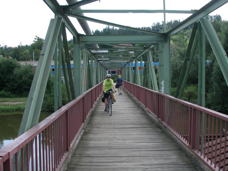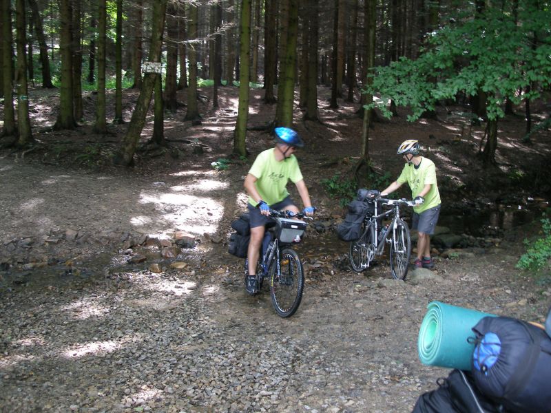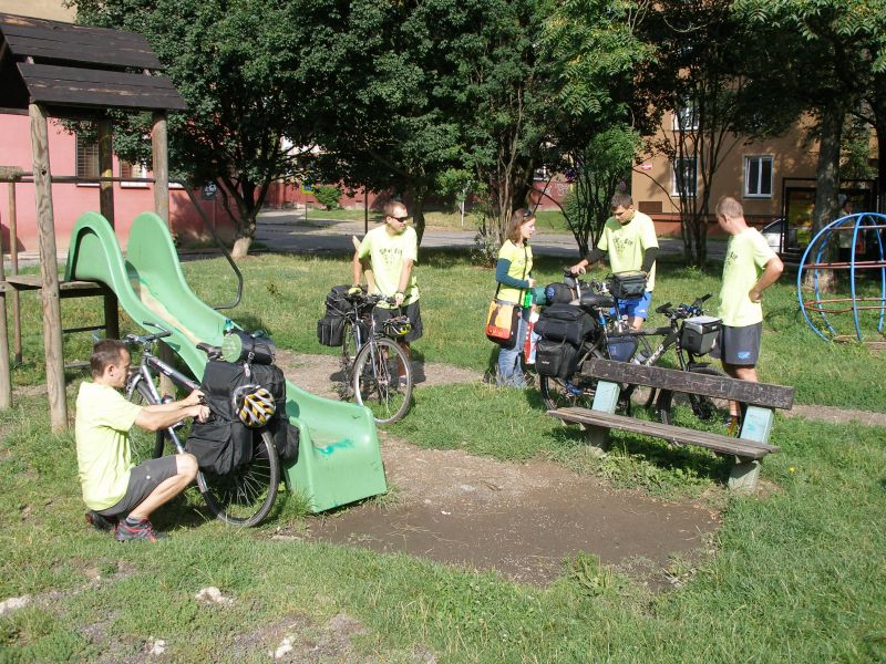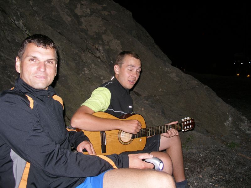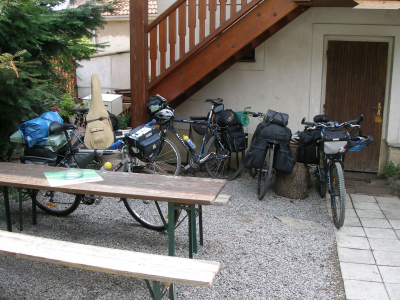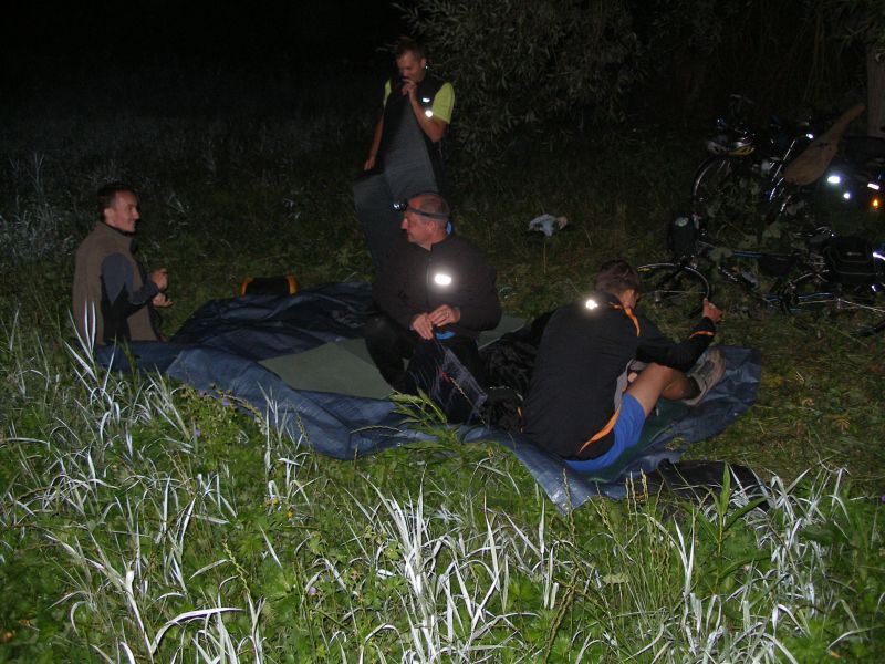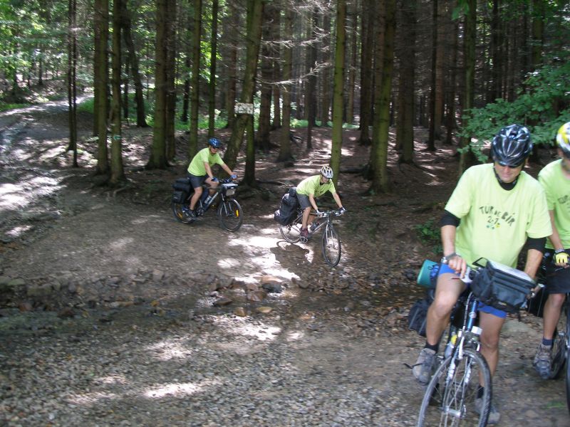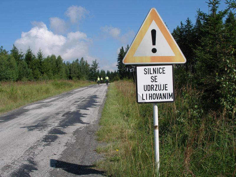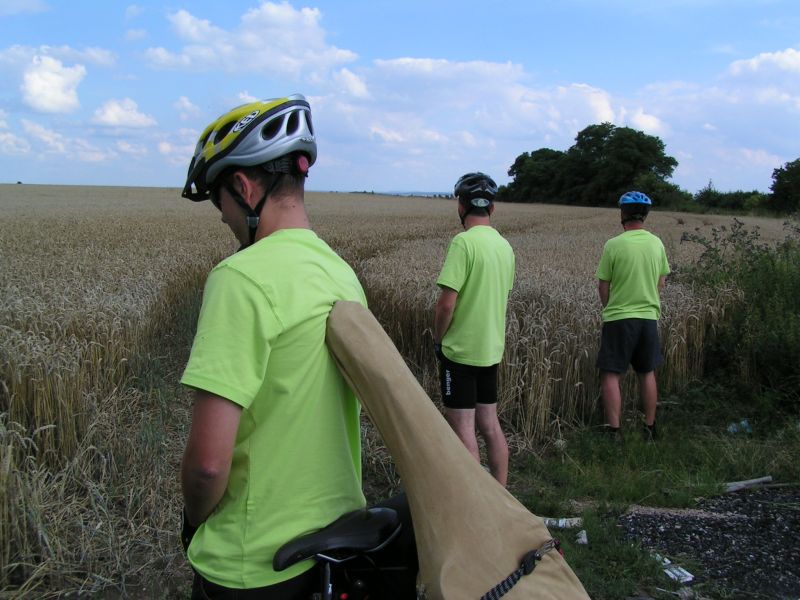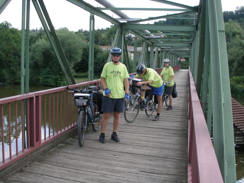 Na místo srazu u Velkého kotle dorazili všichni předem nahlášení účastníci letošního ročníku TdB – Martin, Milan, Pavča, Pepa, Petr a Tomáš. Bohužel Pavča přichází bez kola a se špatnou zprávu, že kvůli nějaké chorobě s námi nejede. Jsme z toho všichni smutní, ale když z batohu vytáhne kromě zelených trik (letošních týmových dresů), také láhev se zeleným obsahem, začnou se naše tváře rozjasňovat. Co se dá dělat, letos to bude čistě pánská jízda. Alespoň nás nic nebude rozptylovat od našeho hlavního cíle – kvalitního sportovního výkonu. Trička se Pavče skutečně povedla. Sklízí za ně ode všech zaslouženě slova chvály. Tomáš dokonce poznal na tričku i ten půllitr, ze kterého měla Pavča největší stresík ;-). Po důkladné ochutnávce přichází nezbytné focení (dokud jsme čistí a svěží). Přichází také první fanynka, vyptává se odkud a kam jedeme. To, že jí je asi 70 let, nás nerozhází. Vždyť těch mladých a krásných cestou potkáme nepočítaně … . Protože je krásné počasí, tak je zamítnut návrh některých účastníků, že před odjezdem zajdeme na jedno a pomalu se chystáme k odjezdu. Loučíme se s Pavčou (líbat se s náma nechce s výmluvou, že by nás mohla nakazit, ale Milanovi klidně bacily předává) a vyrážíme směrem Pičín a Buková. Za ní překonáváme brdský hřeben a užíváme si sjezd do Hostomic. Tam dáváme první zasloužené pivko a pokračujeme pohodovou trasou přes Skřipel, Skuhrov, Svinaře. Na oběd si zajíždíme do Haloun, do hospůdky U paviána. Po obědě sjíždíme do Třebáně k Berounce a po jejím překonání vyjíždíme táhlý kopec k Mořině. Za ní koukneme na lom Velká Amerika a pak už uháníme nekonečnou rovinou přes Kozolupy, Rudnou, Jeneč (zastávka na pivo, za obcí pozorování letadel startujících z ruzyňského letiště), Středokluky, Černovičky. Polní cestou dojíždíme do Číčovic a protože se blíží večer, tak se rozprcháváme hledat místo vhodné k přespání. Nic vhodného nenacházíme a místní hospoda, ve které dáváme něco k snědku nás také neuchvacuje, tak se rozhodujeme pro přesun na Okoř, která je nedaleko. Tam je přímo pod hradem otevřená příjemná osvěžovna, ve které setrváme do zavírací hodiny. Za tu dobu stihneme vyřešit závažné společenské otázky, jako je povolební politická situace v ČR, chybějící podprsenka slečny servírky apod. Servírka se celou dobu tváří trochu upjatě, ale nakonec se zachová sympaticky a když už kvůli nám neodloží zavírací dobu, tak nám alespoň natočí piva s sebou. My jí za to slibujeme, že půllitry necháme schované v křoví. Takže se přesouváme před hospodu, přímo k hradní bráně, kde za doprovodu Milanovy kytary (a k Petrově velké radosti) vydržíme ještě pěknou chvíli vyřvávat. Obzvláště při hitu „Na hradě Okoři …“ čekáme, kdy na nás někdo vyběhne z okolních domů. Pak se přesuneme na nedaleké hřiště kde rozložíme bivak a usínáme s romantickým výhledem na hrad. Za dnešek jsme ujeli pěkných 90 km, počasí bylo parádní, jen ty mladé a krásné fanynky jsme nějak nepotkali. Nevadí, zítra je taky den.