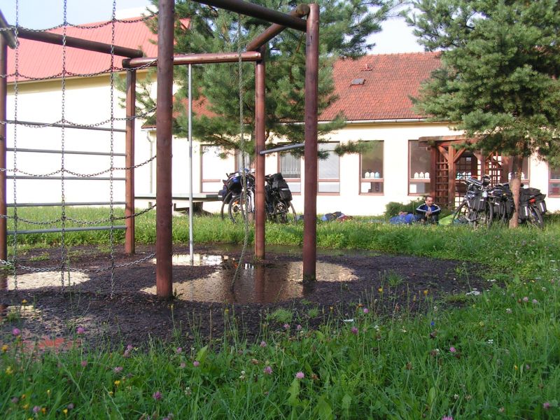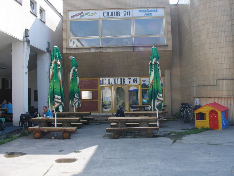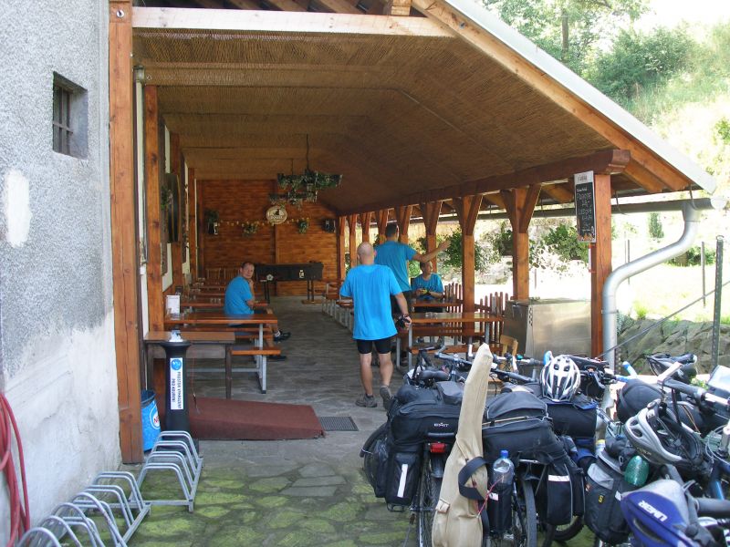 Z Vizovic vyjíždíme po cyklostezce č. 5056 a čeká nás překonání druhého dnešního hřebene. Kopec není tak prudký jako dopoledne, ale dlouhý je dostatečně a povrch je navíc rozbitý. Po cyklostezce vyjedeme až na hřeben a dále pokračujeme po silnici vedoucí do Luhačovic. Cílem je přehrada Luhačovice, kde se chceme vykoupat po náročném dni. Po příjezdu k nádrži však zjišťujeme, že je vypuštěná. Nedá se nic dělat, musíme se osvěžit alespoň vnitřně. Naštěstí v místním kempu objevujeme pěknou restauraci se zastřešenou terasou. Po prvním pivku a prvním úsměvu servírky se nám tam začíná dost líbit, a tak vůl dne dostává úkol, aby (až se někdo dostaví do recepce) zjistil, zda bychom tam mohli přespat, vysprchovat se apod. Když se objeví sympatická, blonďatá slečna recepční, chtěli by být najednou za vola všichni – teda kromě Pavči. Pepa však není zvyklý zříkat se své zodpovědnosti, a tak se vypraví na výzvědy. Přespat pod širákem v kempu můžeme, sprcha bude taky příjemná, a proto jednomyslně schvalujeme, že tu zůstanem.