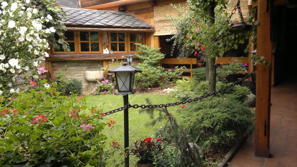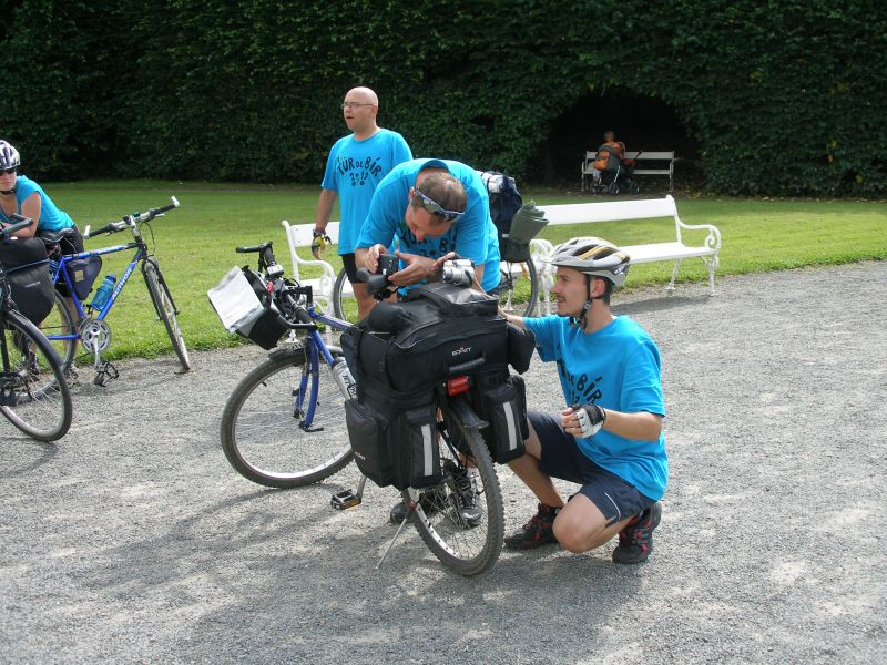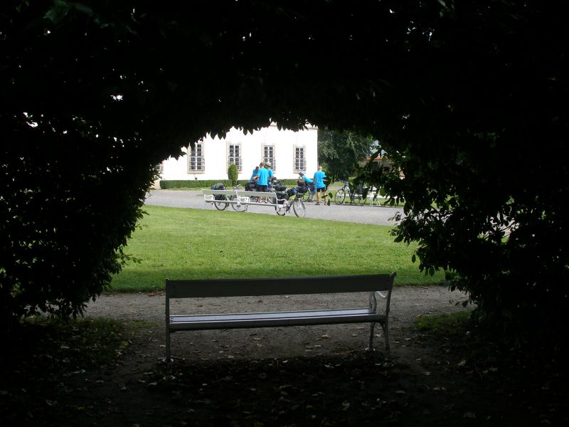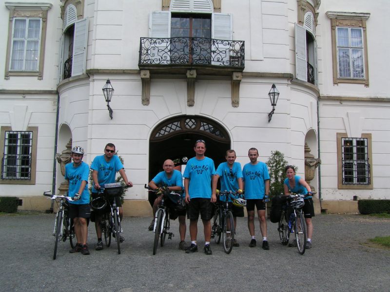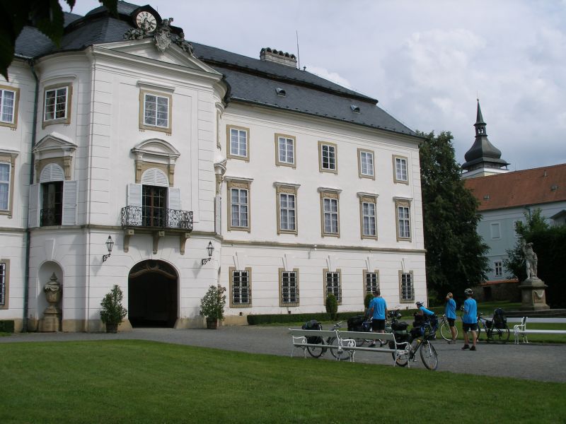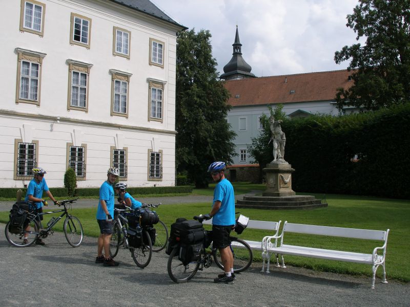 Potom pokračujeme do Vizovic a to bohužel po hlavní a dost rušné silnici. Je nejvyšší čas na oběd a Tomáš si vzpomněl, že ve Vizovicích již nějakou pěknou hospodu navštívil. Je to restaurace „U Tonka“ na náměstí a ukazuje se to jako výborná volba. Nejenže nám vrchní uskladní kola v garáži, ale zastřešené sezení ve dvorku ani jídlo nemá chybu. Potom sháníme po městě nějakou palírnu, kterou bychom mohli navštívit, ale to se nám nedaří a tak se alespoň fotíme v zámecké zahradě.