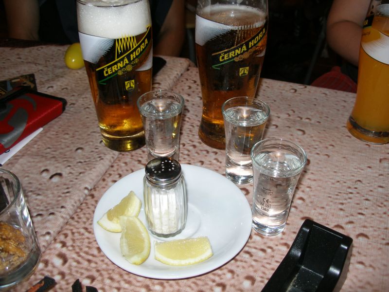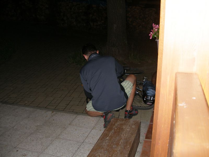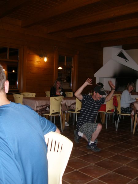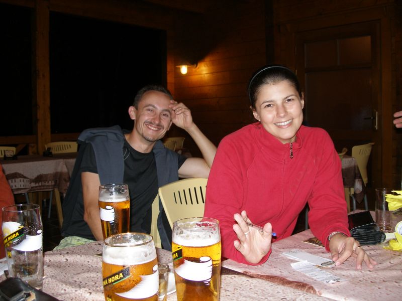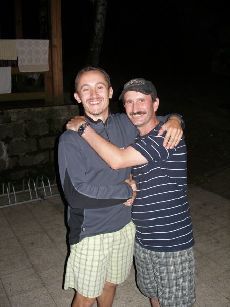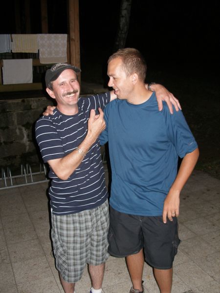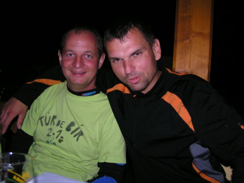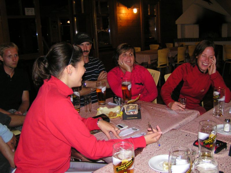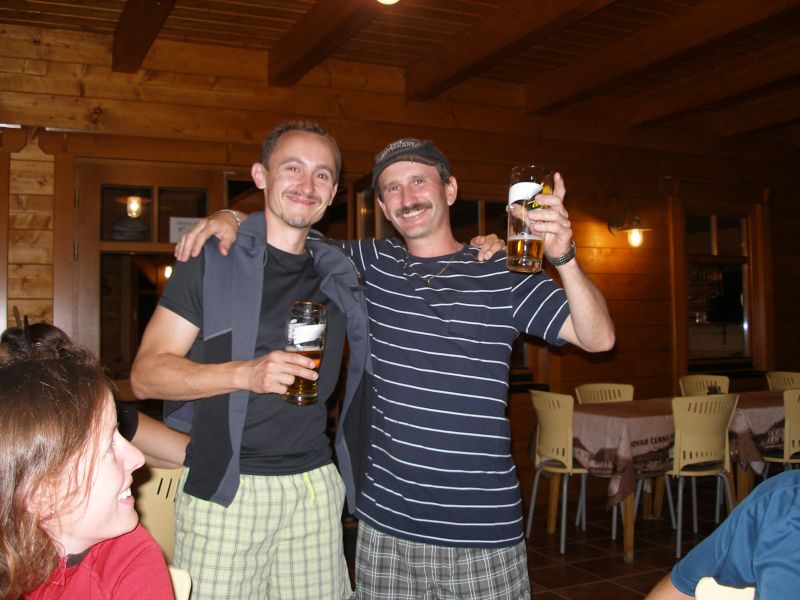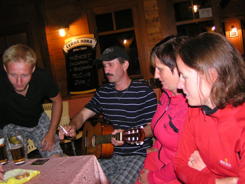 Po sprše, večeři, několika pivech a panácích doplněných o minerály a vitamíny se zábava docela slušně rozjíždí. A v tom se ozve z druhého koutu terasy zvolání: „Adam! Adam Malysz!!!“ Pepa, Petr a Tomáš se smíchem padají pod stůl, ostatní nechápou. Oni ještě neví, že Tomáš je velmi podobný tomuto polskému skokanovi na lyžích a už několikrát si ho s ním někdo spletl. Zvolání pocházelo od bodrého bývalého taky skokana, s ostravskym přizvukem, který byl navíc již trochu pod parou, takže o zábavu na zbytek večera bylo postaráno. Hlavně pro Adama, který díky svému odhalení musel vypít asi dvojnásobek panáků než my ostatní. Skokan se přesunul k našemu stolu i se svojí rodinou, Milan vyndal kytaru a družba mohla začít. Dočkali jsme se i ukázky skoku ze stolu s doskokem do telemarku. Slečna servírka chtěla několikrát zavírat hospodu a strašila nás nerudným správcem kempu, ale muselo jí být jasné, že se nás a hlavně ostravského skokana tak lehce nezbaví. Ten jí nakonec bez nějakého vyptávání přesunul stůl, kde seděla se svými kamarády, k našemu stolu. Vrchol všeho byl, když Petrovi volala Martina, že jí doma teče odpad. Petr nějak nebyl schopen tento problém vyřešit, proto předal telefon volovi dne, ten však taky zklamal. A tak se řešení problému ujal náš nový kamarád! Martině jejich několikaminutový rozhovor asi moc nepomohl, ale my jsme se bavili královsky.