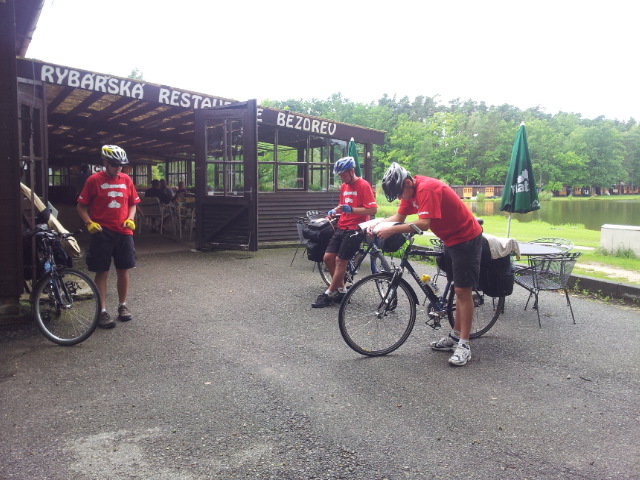 Balíme ,popojíždíme s plnou polní do kempové Rybářské restaurace na snídani.