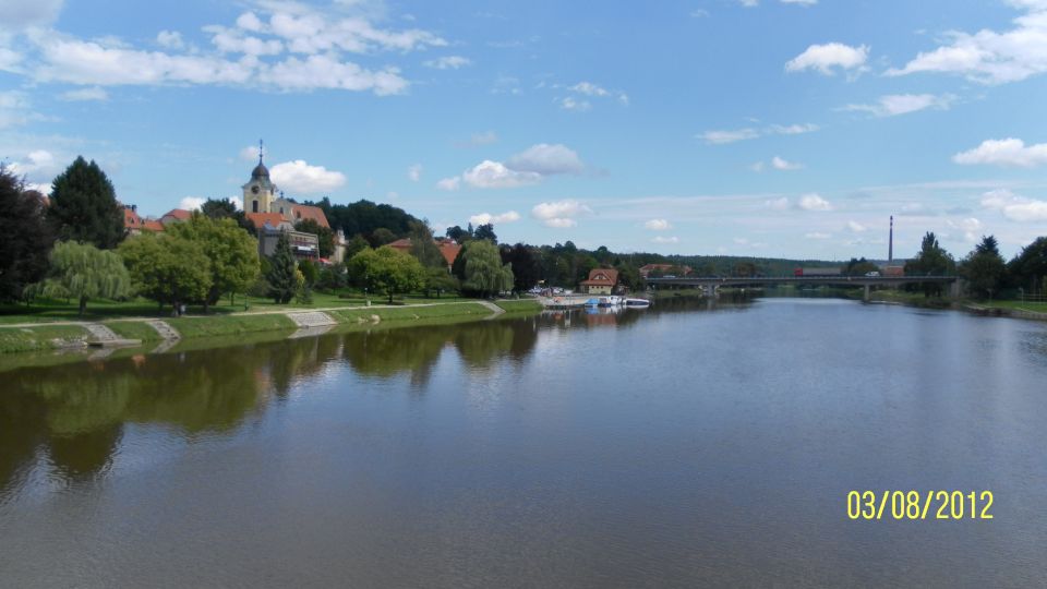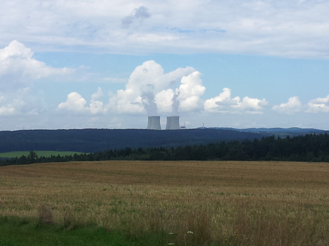 Stoupáme po pravém břehu Vltavy přes Líšnici a Hněvkovice, krásný pohled na zámek Hlubokou střídá pohled na Temelín. Zadky bolí,v nohách křeče,kam nás to jen Petr vleče..Týn nad Vltavou. Obědváme na terásce u řeky, voda v ní už poněkud zhnědla oproti prvnímu dni.