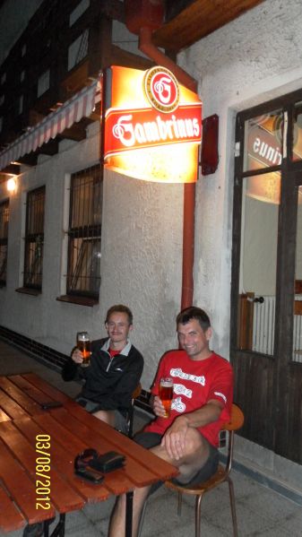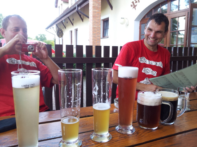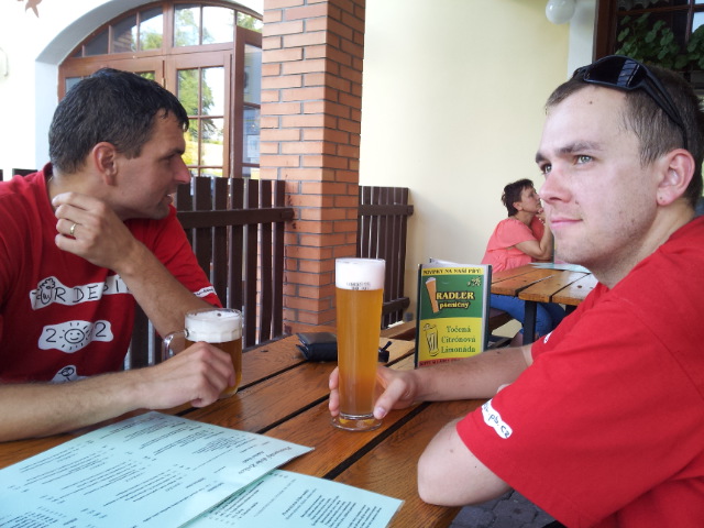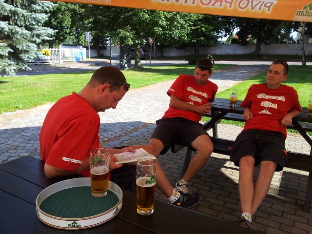 Do cíle dnešní etapy už zbývá kousek. Tomáš doporučuje navštívit pivovarskou hospodu ve Zvíkovském Podhradí. Říká se, třetí den je kritický. Ne,že by jsme byli fyzicky na dně. Ale trička už byla dost jetá. Za námi valící se ozon pravděpodobně způsobil, že nám přidělili nejnepohlednější servírku široko daleko. Ochutnáváme pivní speciály zde vařené…Blíží se večer .