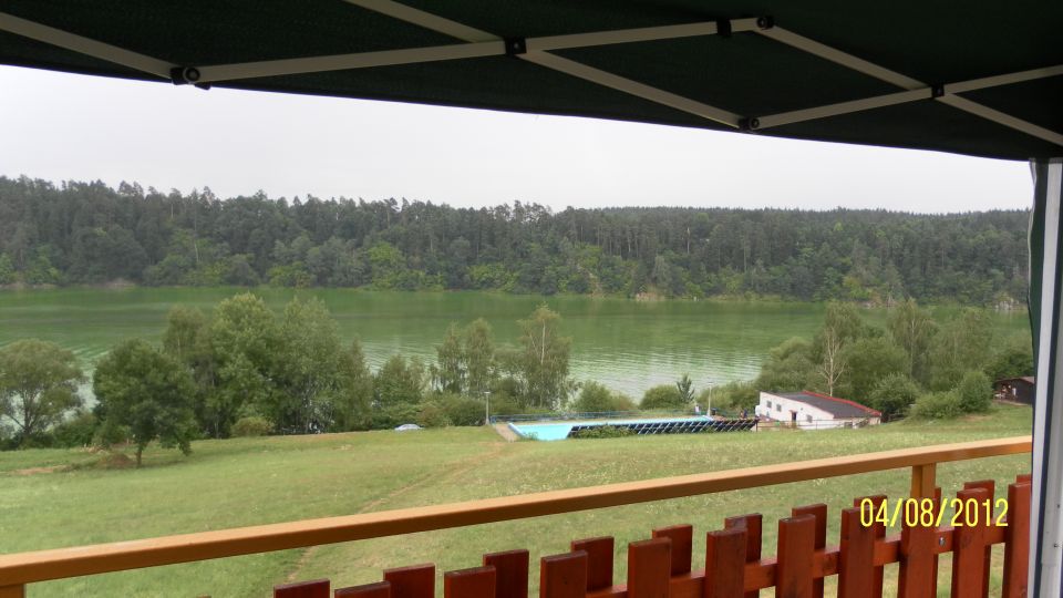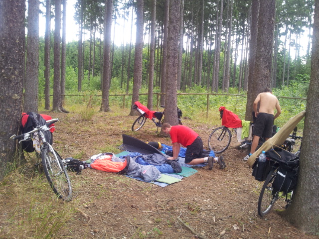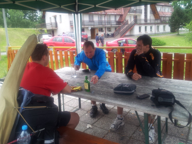 Ráno se probouzíme v lese nad Štědronínem a Tomáš hned varuje, že radar na smartfounu hlásí déšť. Obloha tomu dává za pravdu, tak rychle balíme a sjíždíme do Štědronína na snídani, kterou jsme si včera večer objednali. Ještě než jsme ji spořádali, začalo kapat a bylo jasné, že hned tak nevyjedeme. Naneštěstí výčep měl otvírat až za dlouho a zelňačka došla. Nedalo se nic dělat, přišel čas Jamesona. Než jsme obrátili placatku dnem vzhůru, přestalo pršet a v areálu se vystřídal turnus dětského tábora. Konečně vyrážíme.