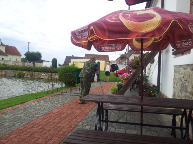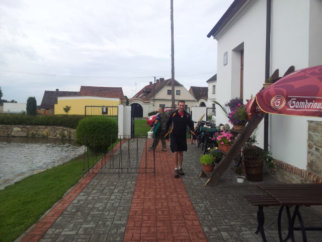 Nejbližší vesnice je Varvažov kde si dáme naše první dnešní pivko. Hospůdka „U Hastrmana“ je tu pěkná s vlastním rybníčkem. Asi v něm jsou i ryby, protože tam nejspíš celou noc chlastali rybáři. Při našem příchodu zrovna poslední dva balili pruty a marně se snažili odvrávorat pryč. Nakonec udělal Milan dobrý skutek o odvedl, skoro odnesl, tyto hendikepované kluky důchodového věku k jejich autu. Není jasné, zda se pak v autě nezabili, ale Milan je určitě zachránil před utopením, neb minout rybník by bez pomoci nezvládli. Odoláváme pokušení objednat si jídlo a vyrážíme směr Orlík přes Nevězice, Probulov a Staré Sedlo.