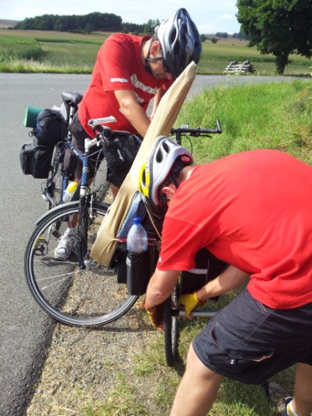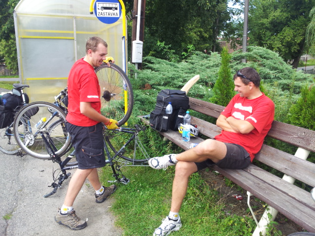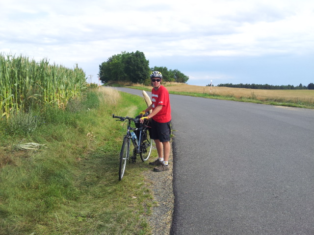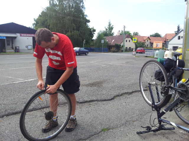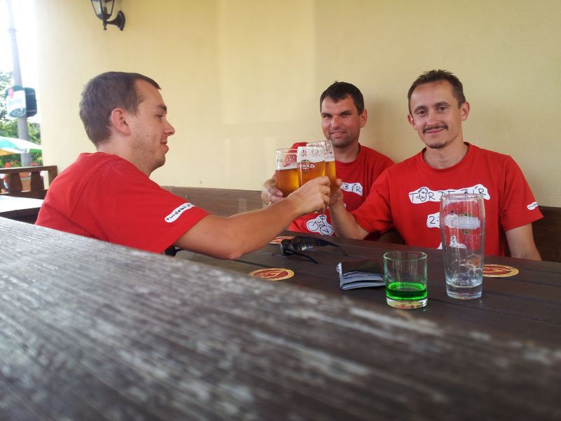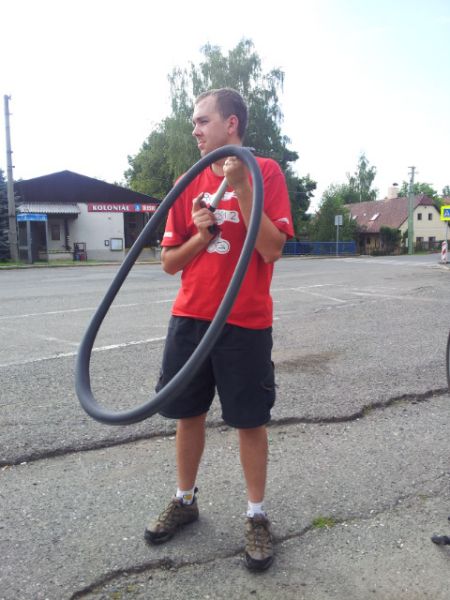 Kletice, Tušovice, Hořejany, Tochovice, Ostrov... a dost. Milan téměř na prahu domova píchnul (pro pobavení Martina a Tomáše samozřejmě). Bez podobné scénky by TdB prostě nebyla úplná. S nadějí, že se kolo jen dofoukne a opraví až doma pokračujeme. Lazsko, Kamená, Třebsko a je jasné, že oprava kola nepočká. Ještě že má právě otvírat místní hospoda. V tom vedru pivo bodne. Oprava kola, po tolika ročnících TdB dobře nacvičená činnost, jde hladce, ale hospodský pořád nikde. Před hospodou začíná být narváno, už tam stepují tři štamgasti a dávají hospodskému jména, které jistě nemá v rodném listě. Dočkali jsme se, hospoda otevřela akorát, když Milan doopravil kolo. Jedno pívo na cestu a hurá dál.