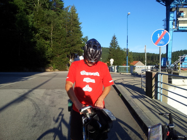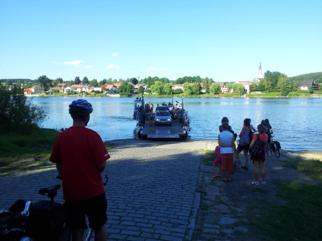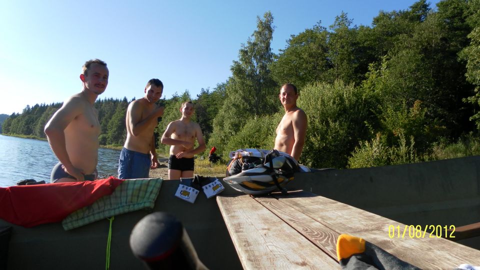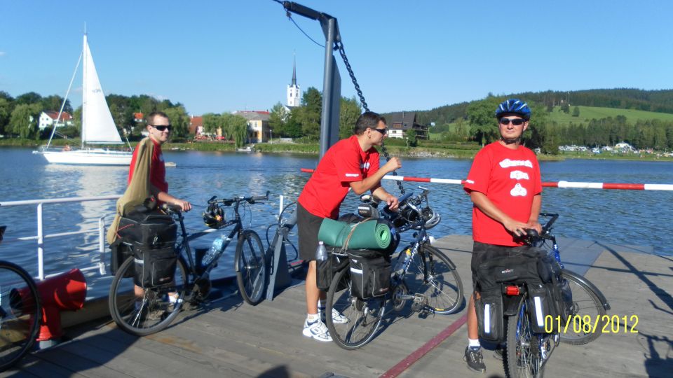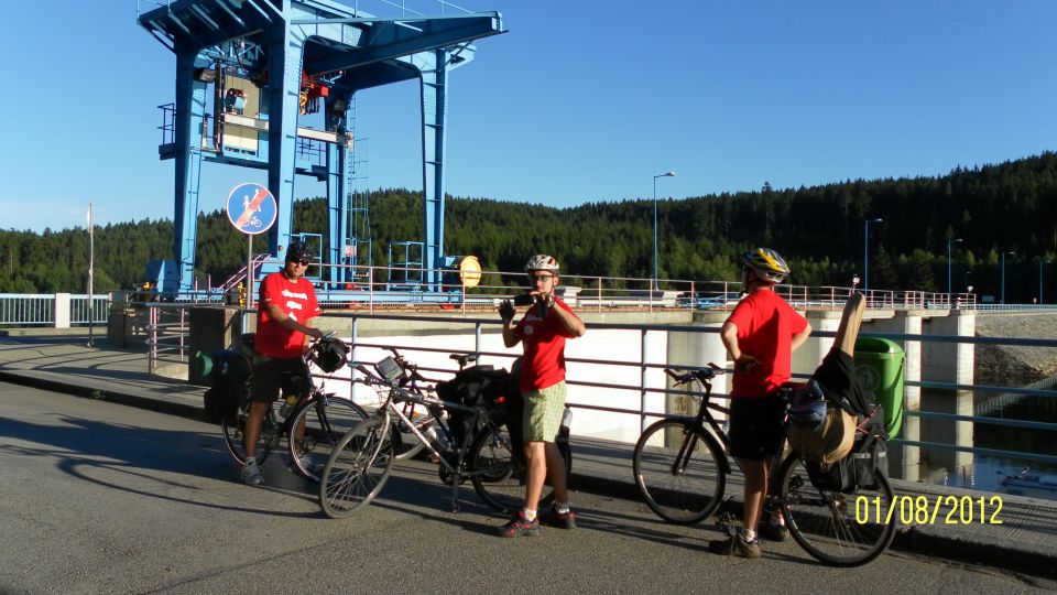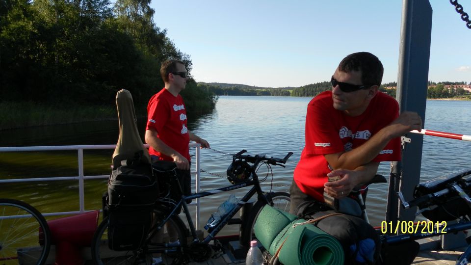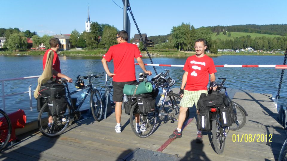 Poté, co vystoupíme z vlaku, pořizujeme ještě několik snímků na nádraží. Připíjíme zelňačkou a pivem z Petrovy petky a vyrážíme směrem na Horní Vltavici a Lenoru. Kousek za Lenorou se zajíždíme podívat k Soumarskému mostu (ve skutečnosti jde o most Rechle u Lenory, viď Petře :-) ) a pokračujeme táhlým kopcem do Českých Žlebů. Tam se rozhodujeme, jestli poobědváme zde, nebo jestli popojedeme do Stožce. Stožec vyhrává, a tak si před obědem ještě užijeme několikakilometrový sjezd zpátky k Vltavě. Ve Stožci dáváme oběd a dva kousky a pomalu vyrážíme po cyklostezce do Nové Pece. Pěkná cyklostezka vede podél Vltavy a zároveň podél železnice, kterou několikrát přejíždíme. Je tu spousty cyklistů a cyklistek, a tak je na co koukat. Z Nové Pece vyrážíme do pěkného kopce ke Schwarzenberskému kanálu. Po pár kilometrech zastavujeme u občerstvení a doplňujeme potřebné tekutiny. Potkáváme zde herce Jana Čenského a taky jednoho cyklistu, který vyjel tzv. „na hyenu“ a shání duši do horského kola. Po doplnění tekutin pokračujeme k Lipenské nádrži a dále do Frýdlavy, kde se potřebujeme dostat přívozem na druhou stranu Vltavy do Frymburku. Po příjezdu k přívozu zjišťujeme, že nám jede až za čtyřicet minut, tak se nedá nic dělat, a musíme na jedno rychlý do nedaleké restaurace. Dává se s námi do řeči maník od vedlejšího stolu. Nakonec vyjde najevo, že zná Martina z fotbalu. Čas rychle utíká a musíme chvátat, aby nám přívoz nakonec neodplul. Na druhé straně Lipenského jezera usedáme opět na kola a pokračujeme v cestě po Vltavské cyklostezce směrem na Lipno. Je krásné počasí, a tak zastavujeme na vykoupání v Lipenské nádrži. Voda je super a ještě lepší je pohled na děvčata na kolečkových bruslích, která jezdí okolo. Po osvěžující koupeli začínáme mít hlad a přemýšlíme co s večeří. Pro dnešní den jsme zvolili konečnou zastávku v Loučovicích. Po příjezdu na nás městečko nepůsobí moc přívětivě, ale co se dá dělat, máme hlad a hlavně žízeň. Dříve, než usedneme do hospody, hledáme místo na spaní. Moc příležitostí nemáme, a tak vybíráme místo mezi nějakou továrnou a řekou. Ani s hospodou nemáme moc štěstí, pivo je sice dobré, ale celý objekt i s hotelem působí nějak nevábně. Po dnešním náročném dni jsme pěkně unavení, tak se po večeři a několika pivech odebíráme k řece, rozbalujeme karimatky a spacáky a po vyčištění zubů zelňačkou uleháme.