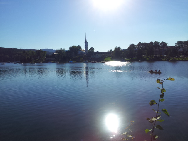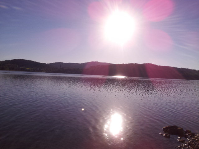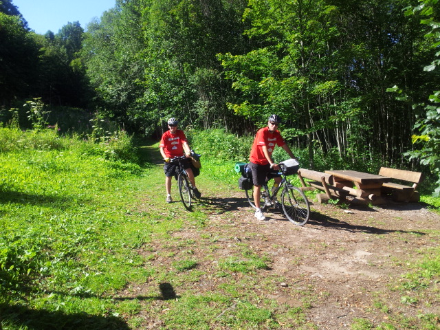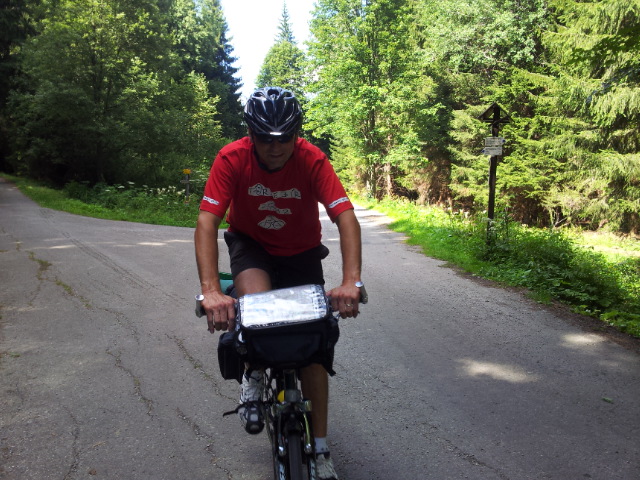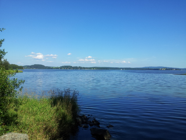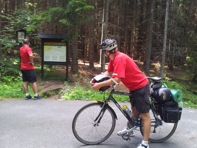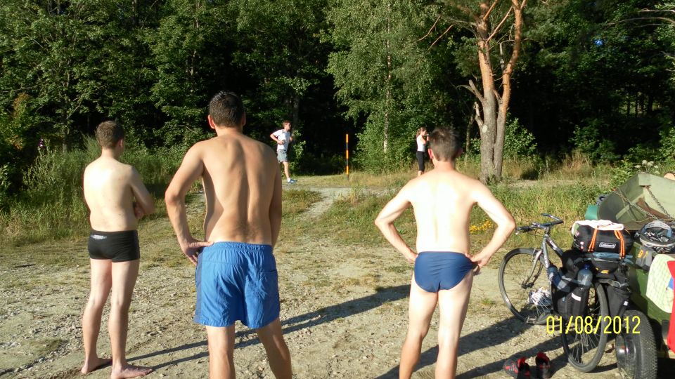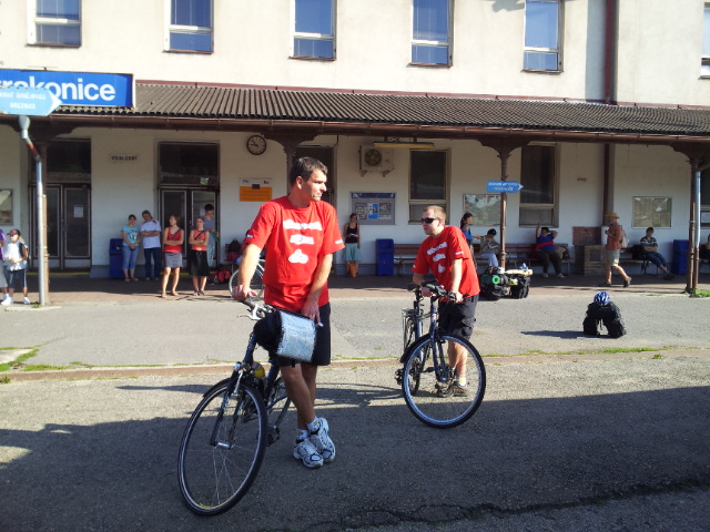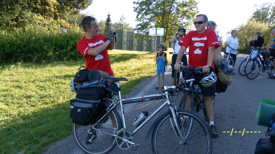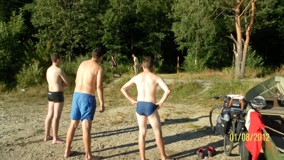 Poté, co vystoupíme z vlaku, pořizujeme ještě několik snímků na nádraží. Připíjíme zelňačkou a pivem z Petrovy petky a vyrážíme směrem na Horní Vltavici a Lenoru. Kousek za Lenorou se zajíždíme podívat k Soumarskému mostu (ve skutečnosti jde o most Rechle u Lenory, viď Petře :-) ) a pokračujeme táhlým kopcem do Českých Žlebů. Tam se rozhodujeme, jestli poobědváme zde, nebo jestli popojedeme do Stožce. Stožec vyhrává, a tak si před obědem ještě užijeme několikakilometrový sjezd zpátky k Vltavě. Ve Stožci dáváme oběd a dva kousky a pomalu vyrážíme po cyklostezce do Nové Pece. Pěkná cyklostezka vede podél Vltavy a zároveň podél železnice, kterou několikrát přejíždíme. Je tu spousty cyklistů a cyklistek, a tak je na co koukat. Z Nové Pece vyrážíme do pěkného kopce ke Schwarzenberskému kanálu. Po pár kilometrech zastavujeme u občerstvení a doplňujeme potřebné tekutiny. Potkáváme zde herce Jana Čenského a taky jednoho cyklistu, který vyjel tzv. „na hyenu“ a shání duši do horského kola. Po doplnění tekutin pokračujeme k Lipenské nádrži a dále do Frýdlavy, kde se potřebujeme dostat přívozem na druhou stranu Vltavy do Frymburku. Po příjezdu k přívozu zjišťujeme, že nám jede až za čtyřicet minut, tak se nedá nic dělat, a musíme na jedno rychlý do nedaleké restaurace. Dává se s námi do řeči maník od vedlejšího stolu. Nakonec vyjde najevo, že zná Martina z fotbalu. Čas rychle utíká a musíme chvátat, aby nám přívoz nakonec neodplul. Na druhé straně Lipenského jezera usedáme opět na kola a pokračujeme v cestě po Vltavské cyklostezce směrem na Lipno. Je krásné počasí, a tak zastavujeme na vykoupání v Lipenské nádrži. Voda je super a ještě lepší je pohled na děvčata na kolečkových bruslích, která jezdí okolo. Po osvěžující koupeli začínáme mít hlad a přemýšlíme co s večeří. Pro dnešní den jsme zvolili konečnou zastávku v Loučovicích. Po příjezdu na nás městečko nepůsobí moc přívětivě, ale co se dá dělat, máme hlad a hlavně žízeň. Dříve, než usedneme do hospody, hledáme místo na spaní. Moc příležitostí nemáme, a tak vybíráme místo mezi nějakou továrnou a řekou. Ani s hospodou nemáme moc štěstí, pivo je sice dobré, ale celý objekt i s hotelem působí nějak nevábně. Po dnešním náročném dni jsme pěkně unavení, tak se po večeři a několika pivech odebíráme k řece, rozbalujeme karimatky a spacáky a po vyčištění zubů zelňačkou uleháme.