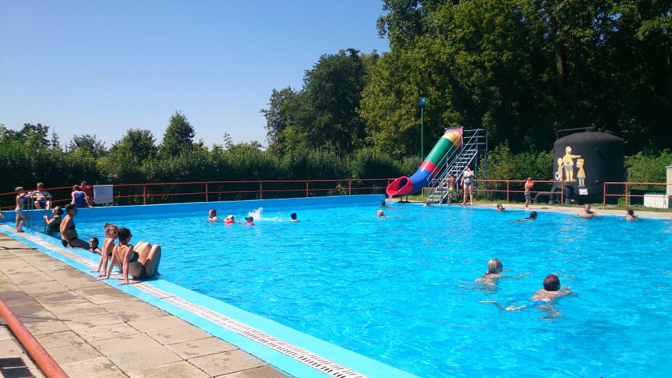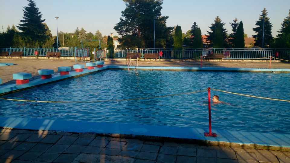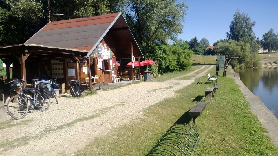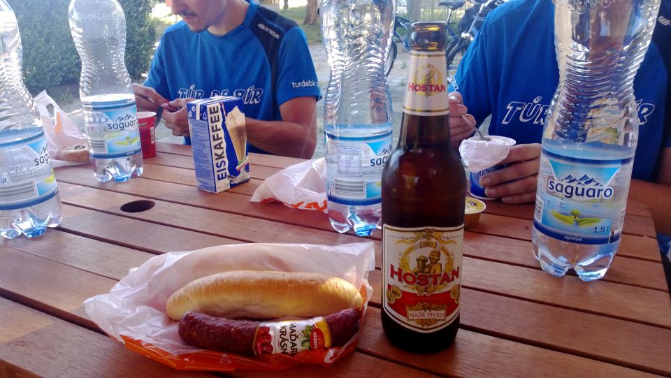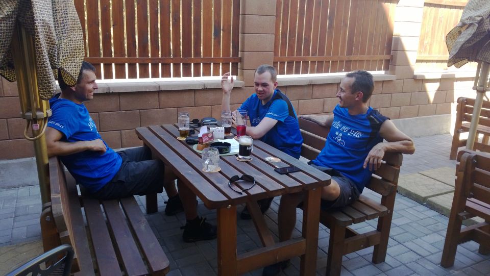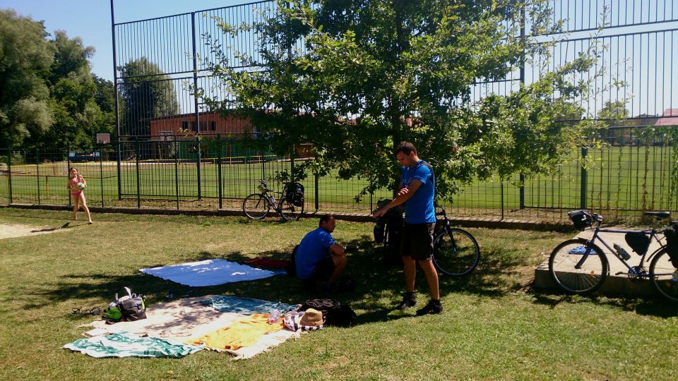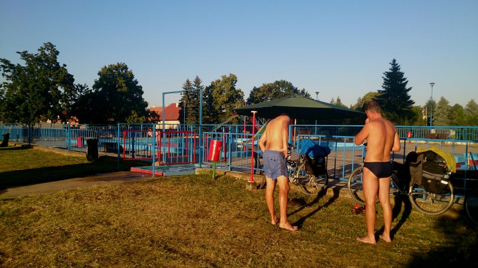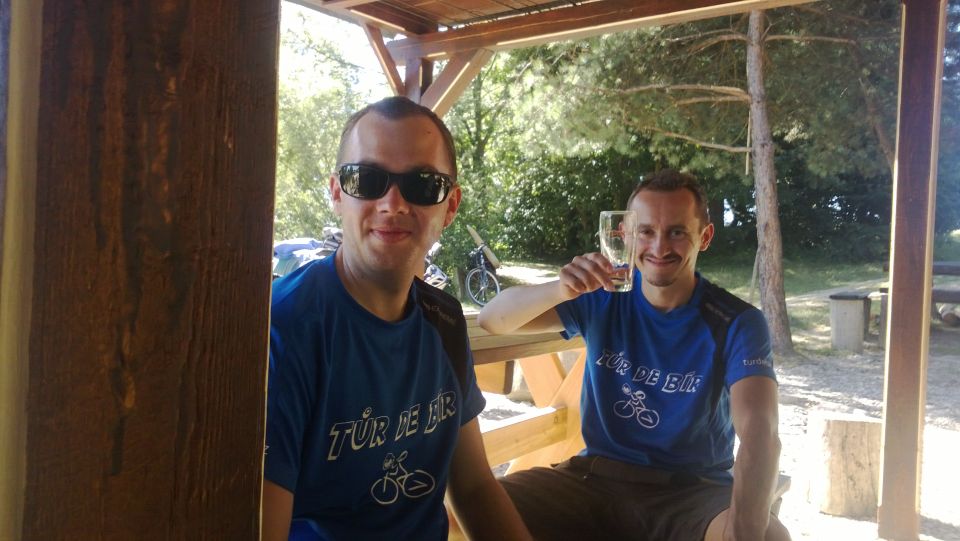 Dáváme menší oběd – klobásu a 2 kozlíky. Pak už vyrážíme dále směr Jaroslavice – Hrádek – Dyjákovice. Rychle se občerstvujeme pivkem a kofolou, abychom dodržovali pitný režim. I přes velké horko, kdy teploty dosahují přes 35 °C, pokračujeme dále po pěkných cyklostezkách na Hevlín a Nový Přerov. Tady se rozhodujeme, zda pojedeme rovnou do Novosedel na večeři, kde byl Tomáš nedávno na dovolené s rodinou, nebo na nedaleké koupaliště do Březí. Tomáš telefonicky ověřuje otevírací dobu koupaliště a po jejím zjištění se rozhodujeme popojet ještě 7 kilometrů za osvěžením. Po rychlé koupačce a jednom malém pivku vyrážíme zpět do Novosedel. Tam už na nás čeká pečené koleno, které jsme si předem telefonicky objednali, pivko a nějaké to vínko na ochutnání. Po dobré večeři a pár sklenkách vína Milan vytahuje kytaru, ať si ještě poslední večer trochu zazpíváme.