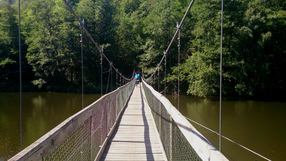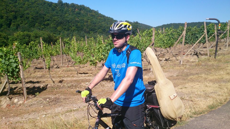 Přes menší problémy s naštelováním telefonu pro samospoušť pořizujeme pár fotografií. Sjíždíme okolo vinic dolů k vodě a přes dřevěnou lávku přejíždíme na druhou stranu Dyje. Nyní nás čeká vyjet velký kopec, který někteří účastníci raději vytlačí.