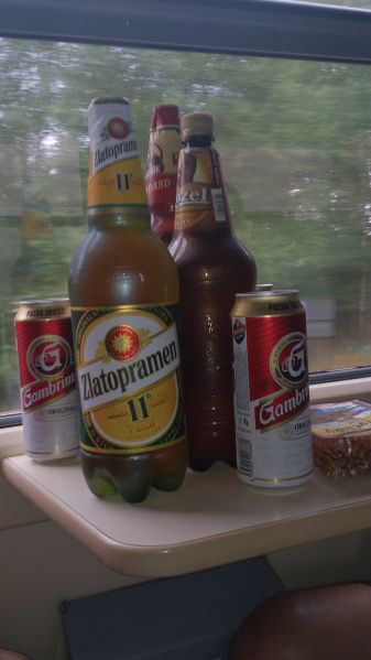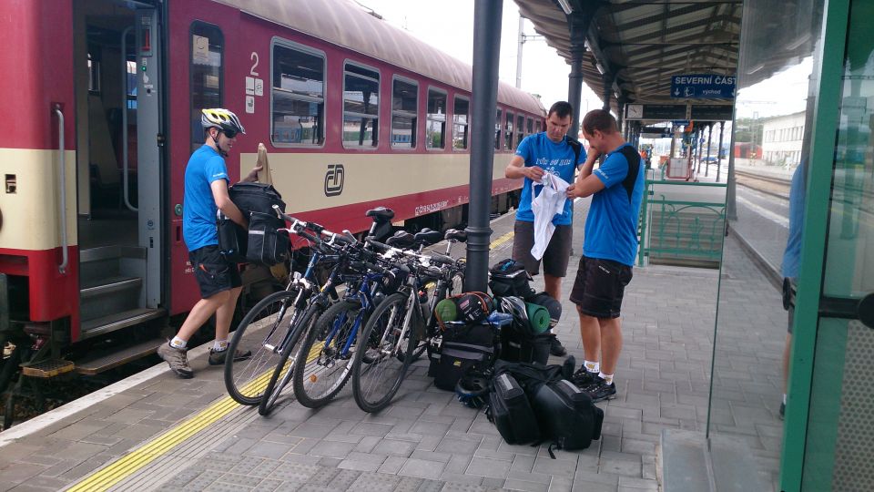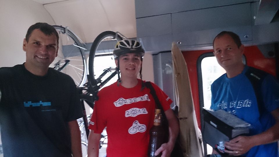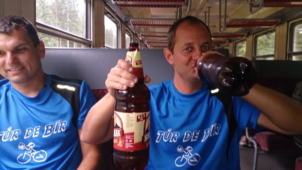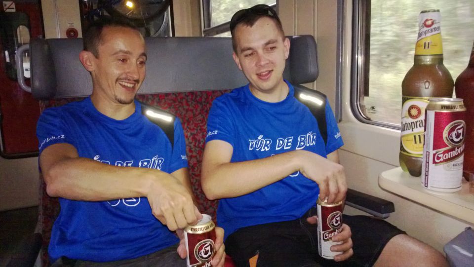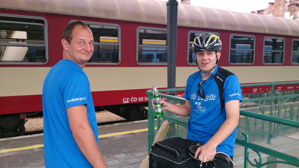 Dvanáctý ročník zahajujeme spořádaně. Lehce po osmé se setkáváme na nádraží v Příbrami. Vše probíhá hladce. Nakládáme kola, usedáme do kupé a začínáme vyndavat laskominy. 3 PETky, 4 Géčka v plechu a 3 zelený není nejsou na rozjezd k zahození. Jsme přece na Tur de Bír ne ? :-). Začínáme ochutnávat jednotlivé druhy a začíná se nám to líbit. Když se ještě převlékneme do nových funkčních, stálobarevných, pachuodolných a samočistících dresů a lístky nám k tomu štípe sympatická a usměvavá průvodčí, vypadá to na pěkný ročník. S blížícími se Budějovicemi mocně finišujeme a za stále častějšího navštěvování toalety obracíme lahve dnem vzhůru. Ještě, že je to rychlík s jen pár zastávkami :-). V takovém stavu jsme snad kromě znojemského ročníku nestartovali.