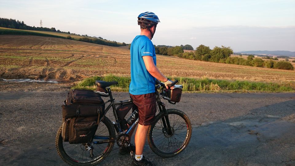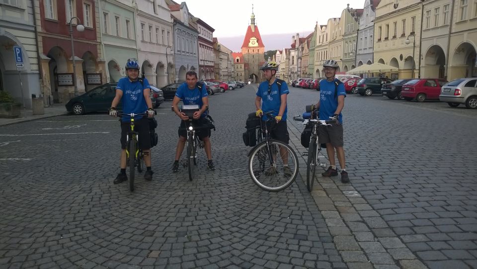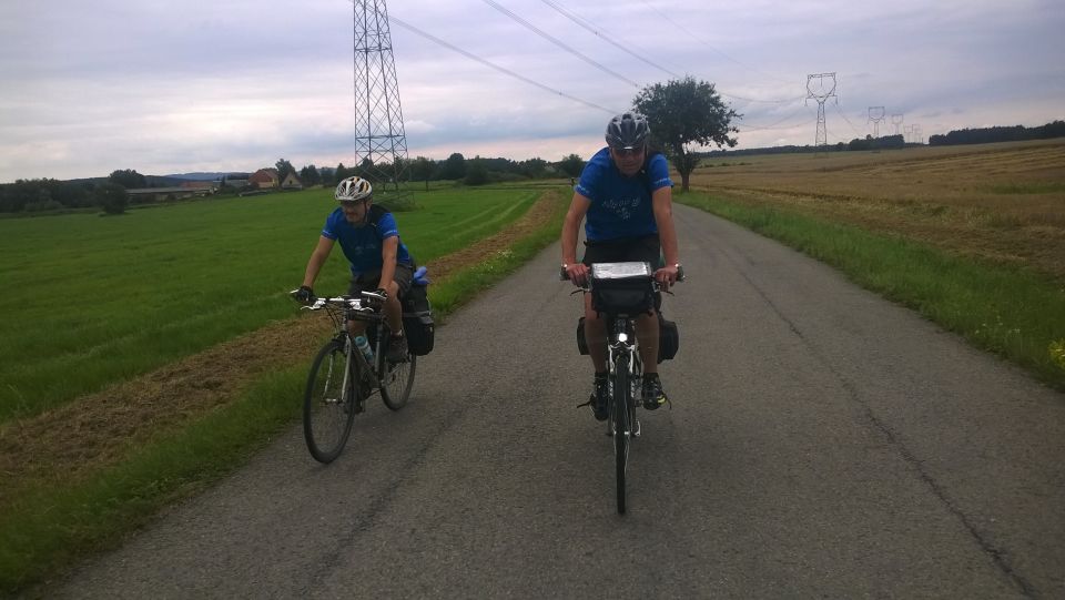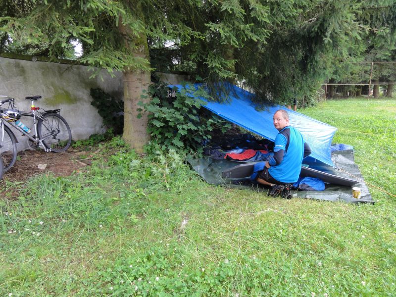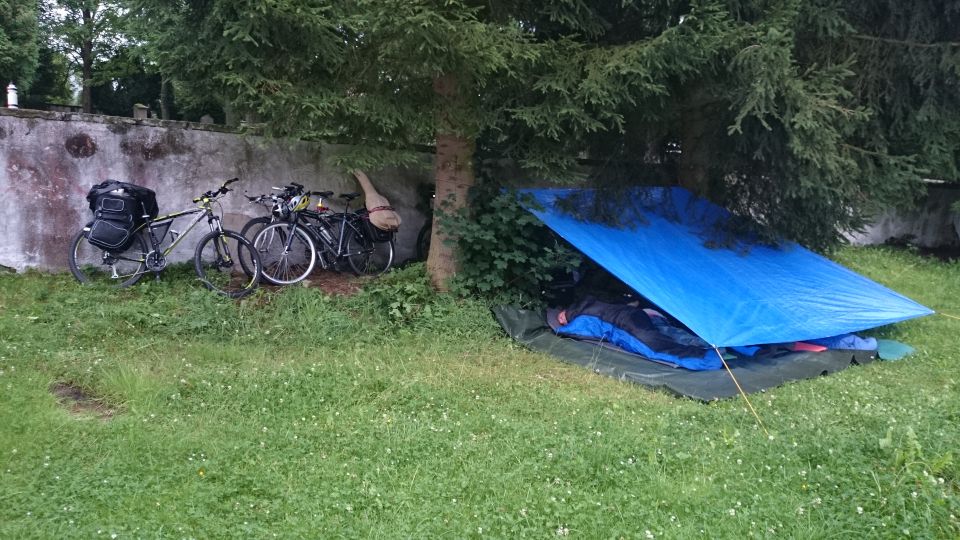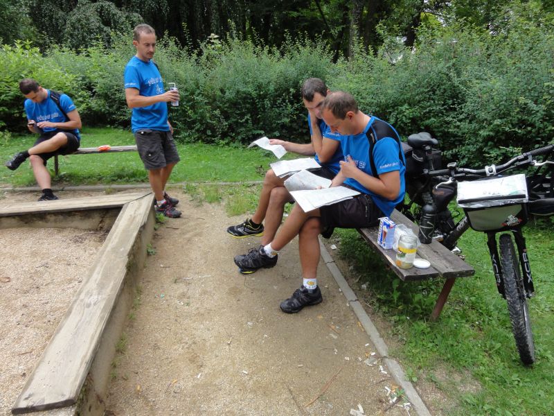 Nad ránem v Halži nás probouzelo vytí psů z nedalekých zahrad, anebo to bylo ze hřbitova, u kterého jsme spali, a vůbec to nebyli psi??? Buď jak buď, vstáváme ve čtvrt na deset a ač to původně moc nevypadalo, přečkali jsme noc bez deště. Bylo to krásné spaní na bývalém hřišti, po noci zpívání v Cafebaru s dvěma místníma chlápkama co nás naučili príma novou písničku o chlupatým zelí a hladký mrkvi. Po probuzení jsme si všimli, že jeden z těch chlapíků dodržel slib a u nohou jsme našli postavenou sklenici kyselých okurek. Následovala rychlá očista zelenkou, u otrlejších jedinců dokonce i kartáčkem se zubní pastou a potom balení. K úžasu nováčka Petra M. přes noc opravdu došlo ke kluky avizovanému samovyprání lehce propocených dresů! Voňaví a svěží tedy vyrážíme na nákup v místním Coopu a dopřáváme si snídani v přilehlém parku. Plánování další trasy se ujali Petr H. a Martin, zatímco někteří z nás začali park zálibně obhlížet, hledajíc místo, kde by se člověk po ránu tak nějak víc uvolnil… Bohužel stromů bylo v parku jako telegrafních sloupů, křoví veškeré žádné, krám byl nedaleko a bylo tam vůbec poněkud rušno, takže veškeré tyto snahy vyšly naprázdno a tak jsme se soustředili pouze na plánování trasy. Po lehce vražedném úvodu z prvního dne jsme se rozhodli v rámci zachování duševního zdraví některých z nás trochu zvolnit režim a sjet z původně plánované trasy podél hranic více do vnitrozemí. Po krásném dlouhém sjezdu z Halže někteří s povděkem vítáme nechtěné zabloudění do lesoparku u Tachova, kde využíváme malou zastávku k velké potřebě…