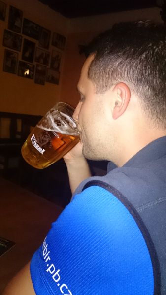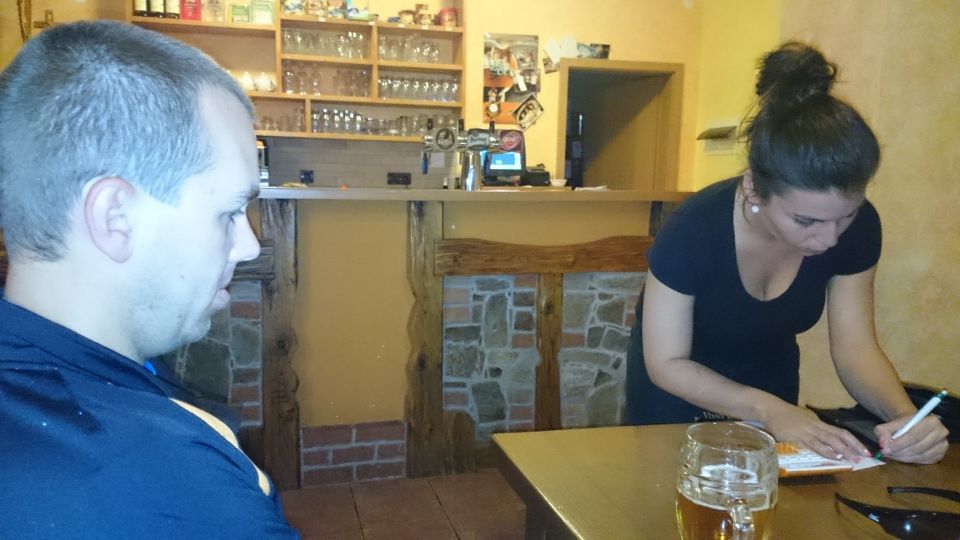 Petr H. si neustále stěžoval na rozbitou šlapku, takže zastavil u Servisu Stihl, na který jsme po příjezdu do Tachova narazili, a jal se jí opravovat. My ostatní jsme se začali věnovat důležitějším věcem, totiž hledání hospůdky s teráskou, protože slunce na nás začalo nepříjemně dorážet a voda se pořád pít nedá. Naštěstí byla jedna příhodná teráska takřka za rohem, takže nás nemohl rozhodit ani opilý domorodec, který dělal trochu tlaky. Zkušeně děláme, že tam nejsme, protože s ožralama nechceme mít co dočinění a rychle si dáváme pivko, aby nám moc neklesla hladinka…