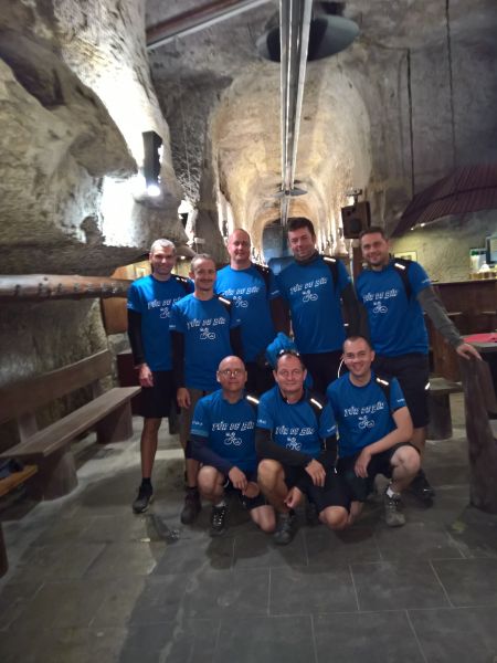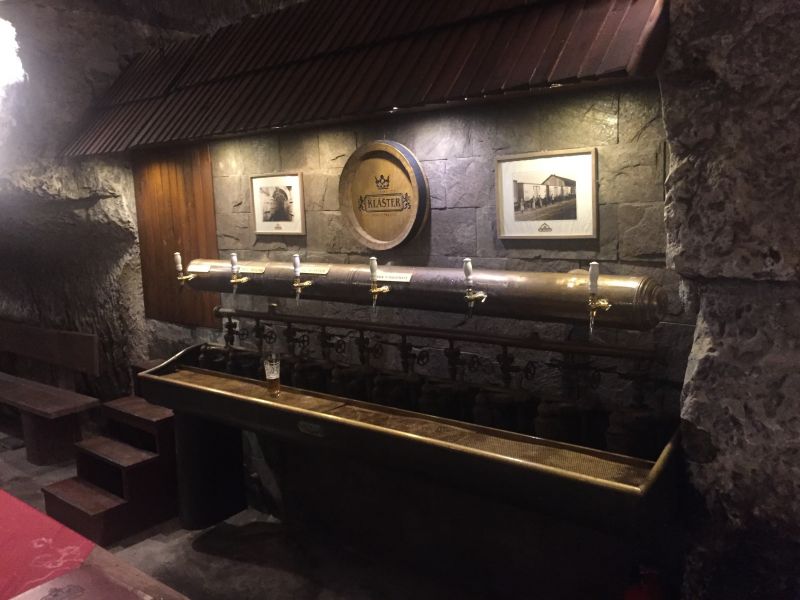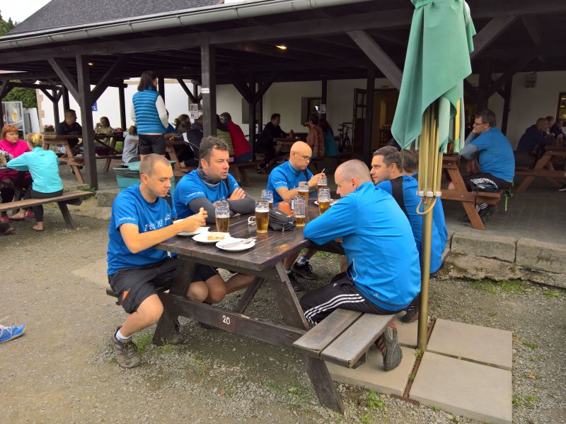 Kolem půl jedenácté dorážíme do Bakova a přijíždíme k místní restauraci. Je všední den, ale restaurace se zahrádkou téměř praská ve švech, zajímavý kraj. Po malém občerstvení se vydáváme přes Malou Bělou do městečka s názvem Hradiště nad Jizerou. Zde na nás čeká krásná restaurace vytesaná ve skále s příznačným názvem Skála. Zasedáme ke stolu a objednáváme si pivko Klášter. Kola necháváme venku neuzamčená. Někteří jsou v takovém stavu, že by pro ně ztráta kola byla spíše vysvobozením, než důvodem k zármutku J. Ještě před odchodem si děláme pár fotek ve spolupráci s ochotným číšníkem.