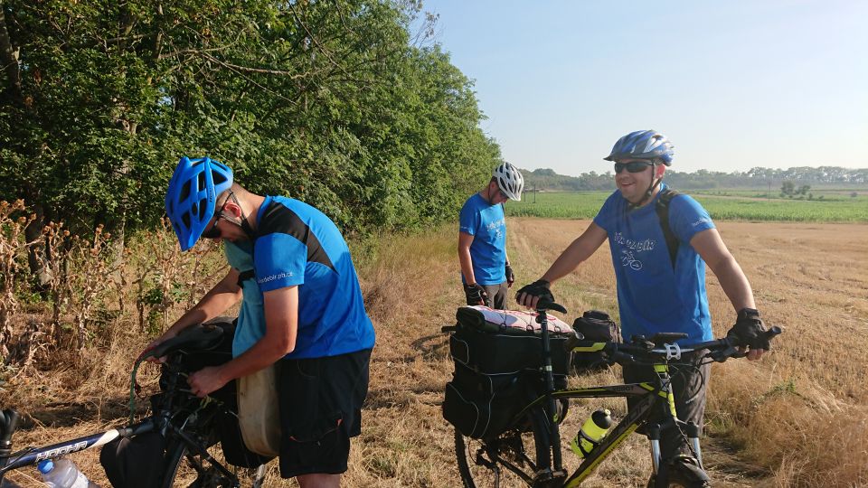 Naše tempo bylo zběsilé a naším revírem byla Morava, takže při průjezdu Dyjákovicemi hledáme kde svlažit hrdla typickým moravským mokem, tedy pivem. Jedeme kolem dvou hospod, ale je vidět, že tu ta pivní tradice ještě není úplně zažitá a hospody jsou i přes kurňa pařák pořád zavřené. Co to je? Ptáme se. Vždyť už bylo určitě půl desáté?! No nic, záchranu určitě přinese místní obchoďák u dětského hřiště, kde ve stínu dubu zastavujeme a já spolu s Martinem vyrážíme na nákup lahváčů. Co to je? Ptáme se znova. Vždyť oni nemají vůbec nic chlazeného. Pomalu se vkrádá zoufalství a vůl co by to všechno zařídil pořád chybí… Naštěstí si někdo předtím všiml ještě jednoho malého krámku kousek zpátky, takže upínáme veškeré naděje tímto směrem. Za chvíli se zpoza zatáčky vynoří naši průzkumníci, ale co je důležitější, mají plné ruce plecháčů! Ne, nepřijela nás zkontrolovat Simča s dětma, jedná se plecháče s malým P a Tom ho má určitě velký. Alespoň dle pravopisu. K svačině tedy vyslopnem jedno osvěžující chlazené Starobrno nebo Kozla v plechu a razíme dál.
