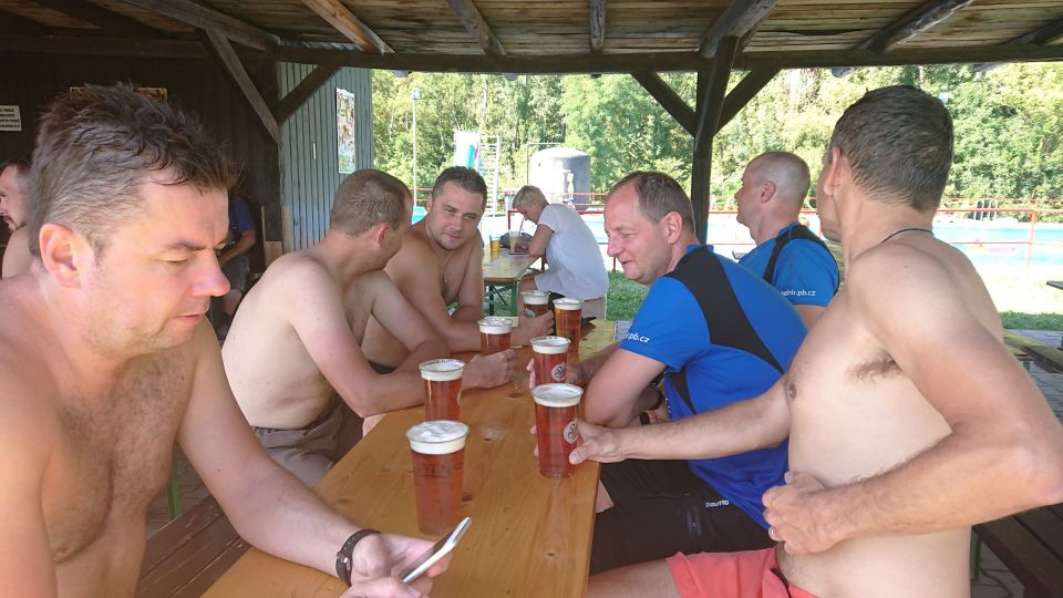 Po zdolání několika dalších kilometrů se dovlečeme v potu tváře do Vrbovce. Kluci to tu znají, takže míříme na jistotu a oběd si dáváme v penzionu Retro. Retro sedí - penzion totiž původně sloužil jako bordel a interiér asi po změně zaměření tohoto podniku moc neřešili. Taky servírka vypadala, že tu prožila ledacos a zanechala zde kus své minulosti. Jídlo bylo ale docela fajn a taky možnost polknout dalších pár pivek a schovat se před sluncem vyvážila veškeré náznaky nepohodlí. Pak se ovšem stalo něco, co jsem na TDB ještě nezažil. Proběhla volba vola. OK, tak tu už jsem zažil, ale ten způsob výběru… Zkrátka, nikdo si stále svými hrdinskými činy neřekl o tento význačný post a už vůbec nikdo nechtěl riskovat, že by volba byla určena nejspravedlivější aplikací, kterou jsem neustále nabízel, a tak počítám, že po dobu mé krátkodobé nepřítomnosti, způsobené nutnou potřebou, byla vytvořena tajná koalice a za vola byl jednohlasně zvolen Petr M., tedy já. A důvod? No už jsem přece dlouho volem nebyl a taky ta apka je prý určitě cinklá. Tsss.