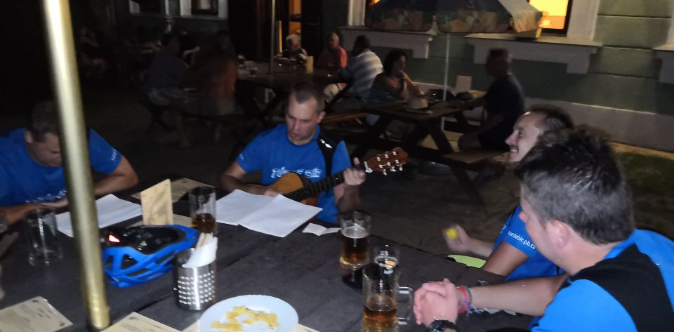 Schyluje se ale k večeru, takže je potřeba zvednout kotvy a popojet o kus dál. Po dalších nekonečných 5ti kilometrech dorážíme v lehce ovíněném stavu do Šatova, kde se rozprcháváme a poohlížíme se po nějakém tom plácku na přespání. Sraz máme v místní hospodě. Volba na spaní padla na místo vybrané Petrem H. a my si po celodenní námaze můžeme konečně na předzahrádce hospody odfrknout. Dáváme večeři, něco málo, no dobře, hodně piv, a Milan hrábne do strun doprovázen vitím nejen naším, ale také několika místních přísedících a známých ze sklípku, kteří tu shodou okolností bydlí v penzionu. Naše produkce je sice velmi kvalitní a jedinečná, ale je také poněkud hlučná, tak jsme po zavíračce požádáni hospodským o její ukončení, protože mu prý někteří sousedi potom dělají problémy. To chápeme, necháme si natočit pár PETek, protože noc je ještě mladá a vyrážíme se zbytkem Ostraváků na doporučení hospodského na místní fotbalový plácek, kde dopíjíme, co máme. Únava ale začíná působit, tak se postupně trousíme a bloudíme k místu našeho dnešního spočinutí, kde padneme za vlast a nabíráme síly do dalšího parného dne.